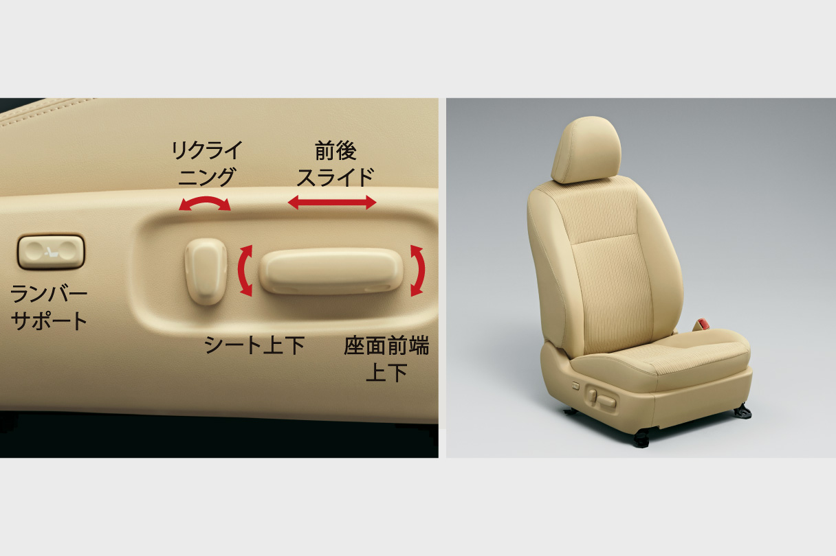 前後スライド、リクライニングに加え、シートの上下、座面前端の上下の調整を電動で行うことができます。腰を支えるランバーサポート付。