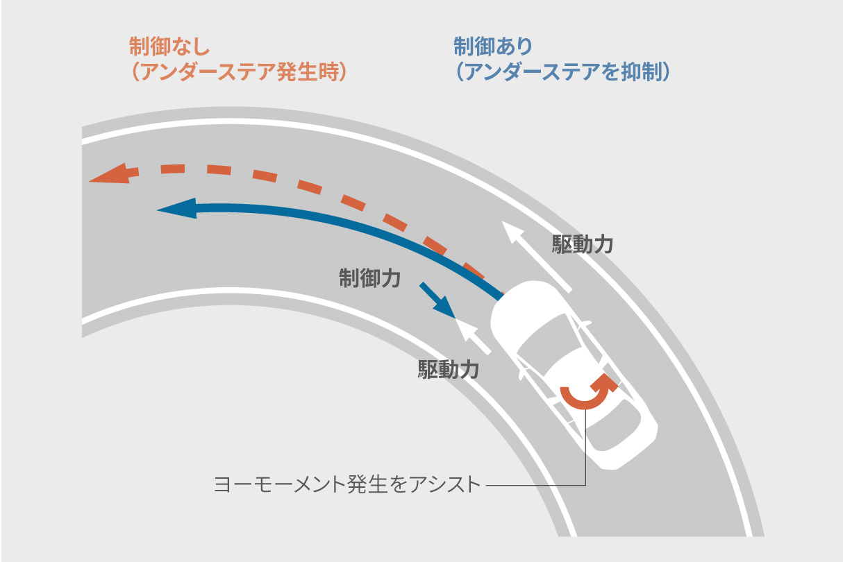 ワインディング走行等のシチュエーションにおいて、ブレーキ制御により内輪の駆動力を調整し、コーナリングをアシストします。