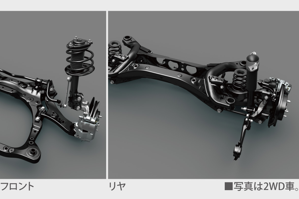 路面の凹凸に応じて、エンジン(ガソリン車)・モーター(ハイブリッド車)のトルクをリアルタイムに制御することで、車体の揺れ(ピッチング)をコントロールし、滑らかでフラットな乗り心地に貢献します。さらにハイブリッド車では、ラフなアクセル操作でのピッチングも抑制し、より滑らかな乗り心地とスムーズな加速感、安定性を実現します。