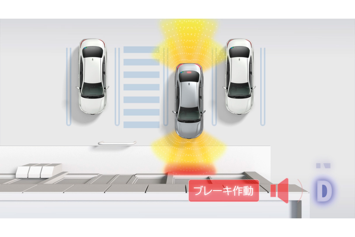 シフト操作時における急発進・急加速を抑制し、衝突時の被害軽減に寄与します。例えば、後退時に衝突して慌てたドライバーが、アクセルを踏み込んだままシフトを「R」から「D」へ変更した際、表示で注意を促し、エンジン出力を抑制。また後退時、必要以上にアクセルを踏み込んで速度が上がりすぎるのを防ぐために、エンジン出力を抑えます。