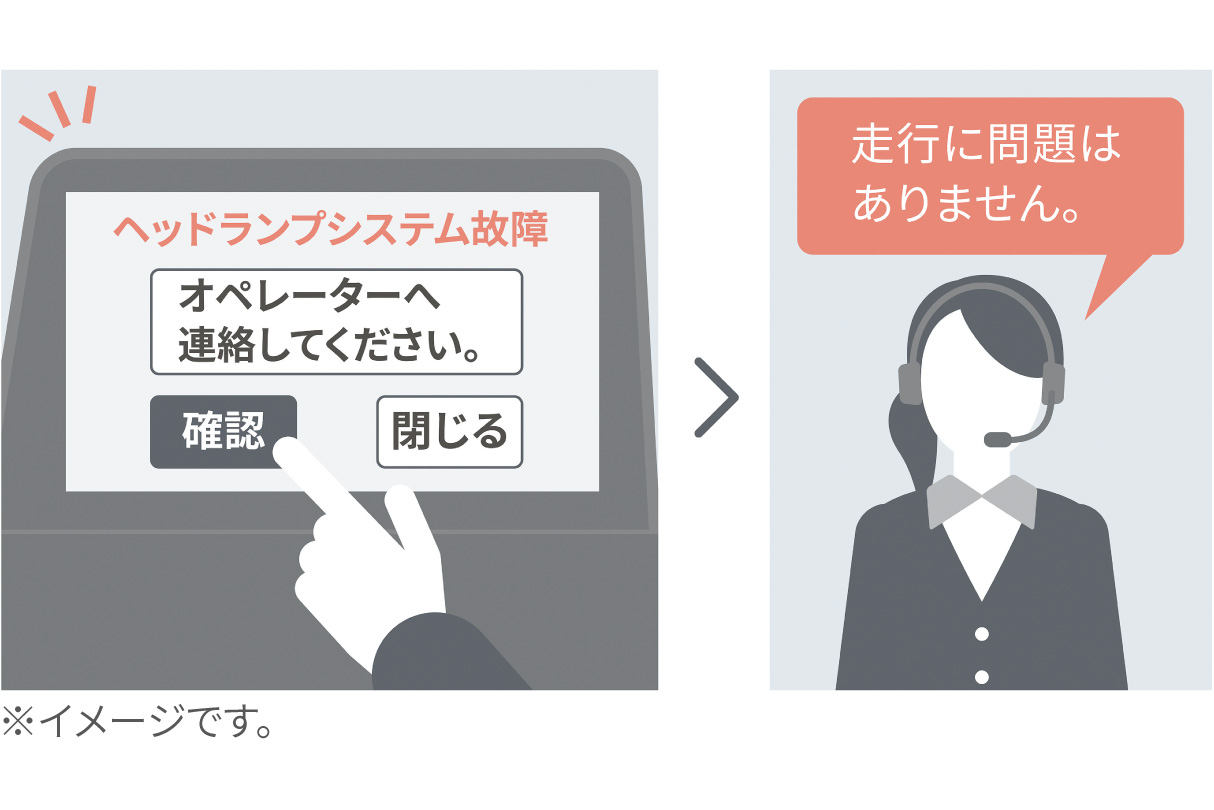 *1. サービスのご利用にはリモートメンテナンス店の登録が必要です。また、利用開始操作の翌日よりご利用いただけます。 *2. 販売店でのご対応は営業時間内に限ります。 *3. 車両にOBD(On-Board Diagnostics)Ⅱ通信を行う機器を接続している場合、正しくサービスが行えない場合があります。 *4. すべての警告灯点灯時に実施するものではありません。走行に支障が出る可能性が高いものに限ります。